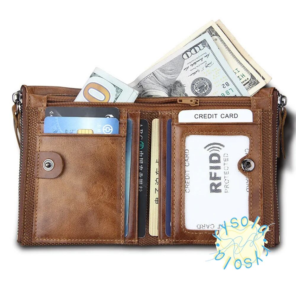 【ブラック】折りたたみ式牛革ウォレット 革ショートウォレット コインホルダー ダブルジッパー レトロスタイル T240610165439_04