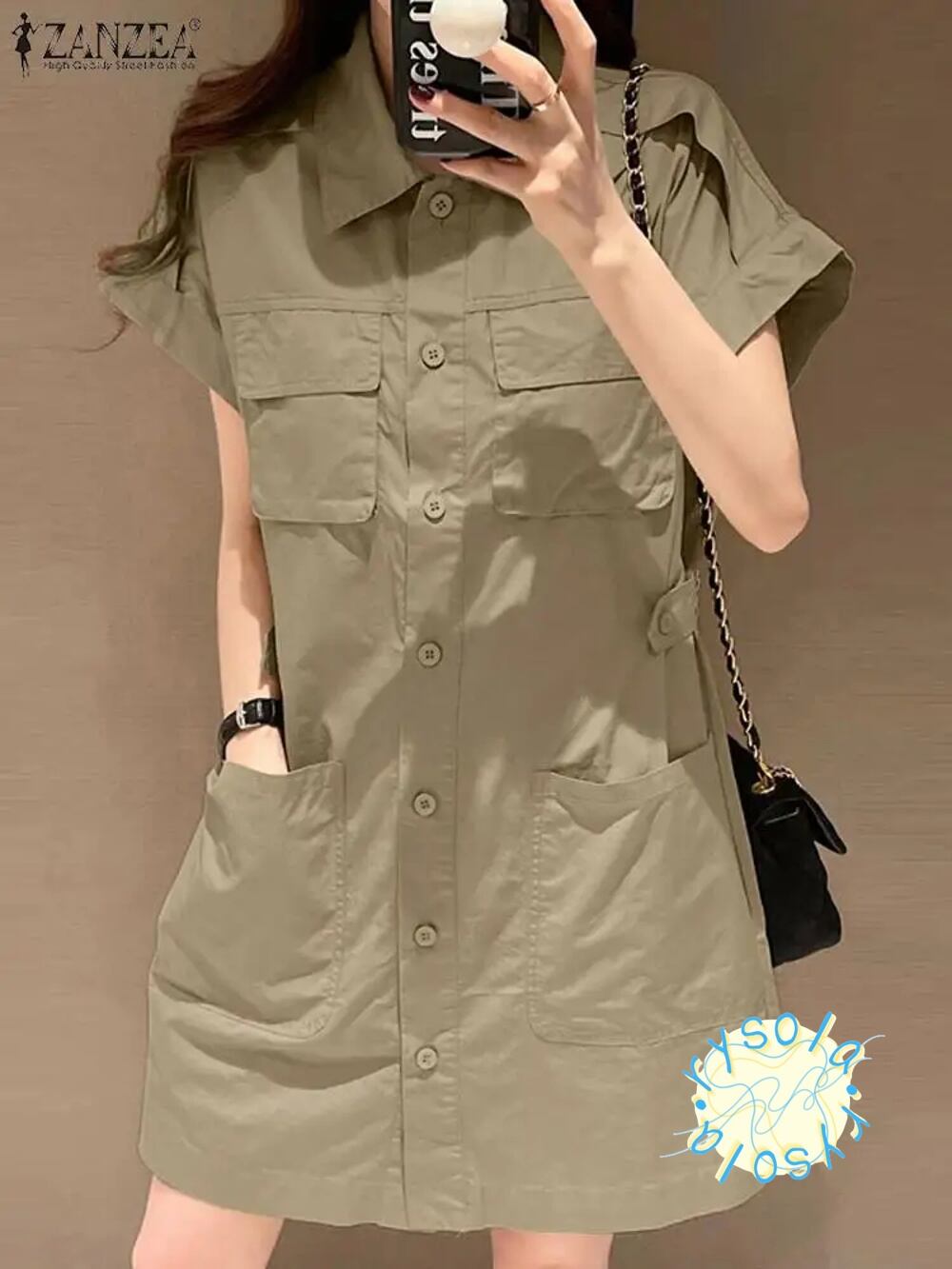 サマードレス レディースカーゴシャツドレス 半袖 襟 カジュアル T240610215431_01