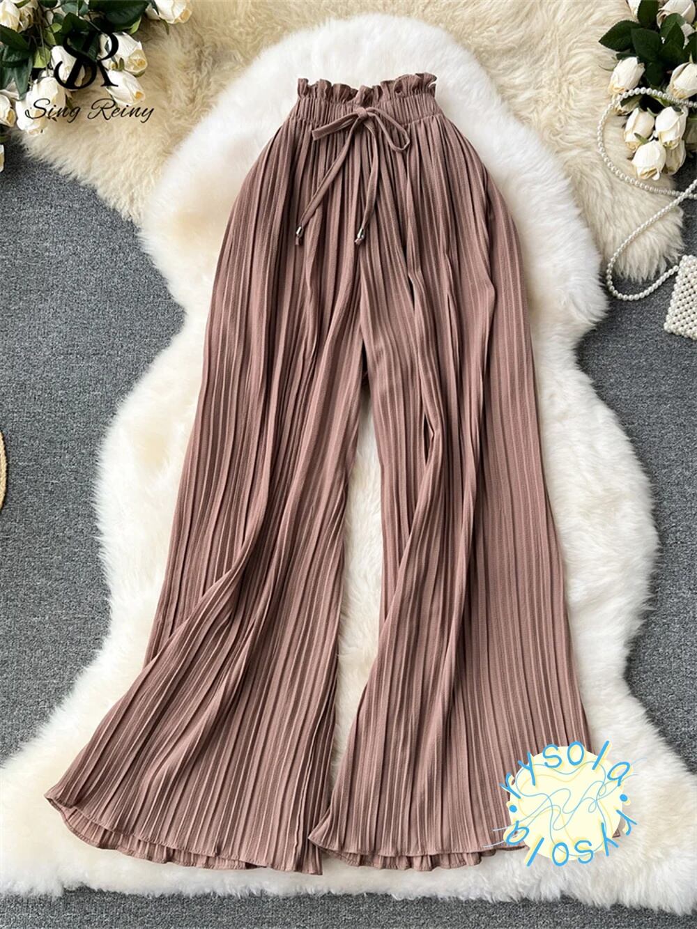 カジュアルパンツ ハイウエスト ドレープ ワイドレッグパンツ ソリッドロングプリーツパンツ 夏 T240612101834_07