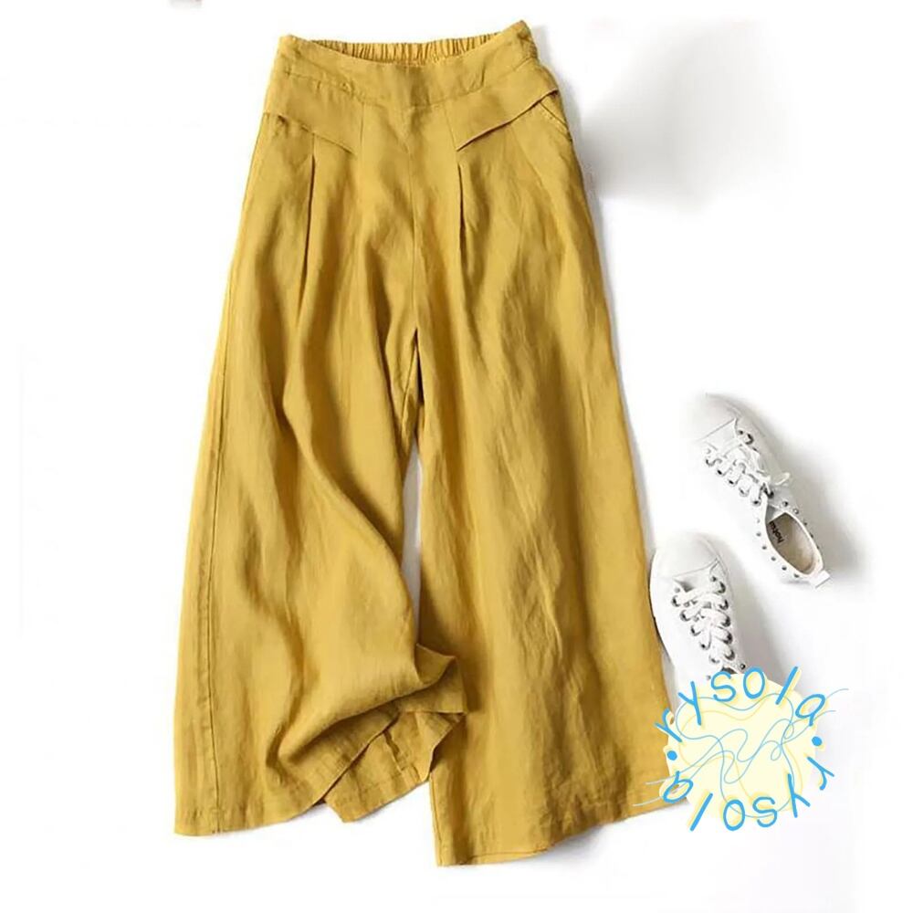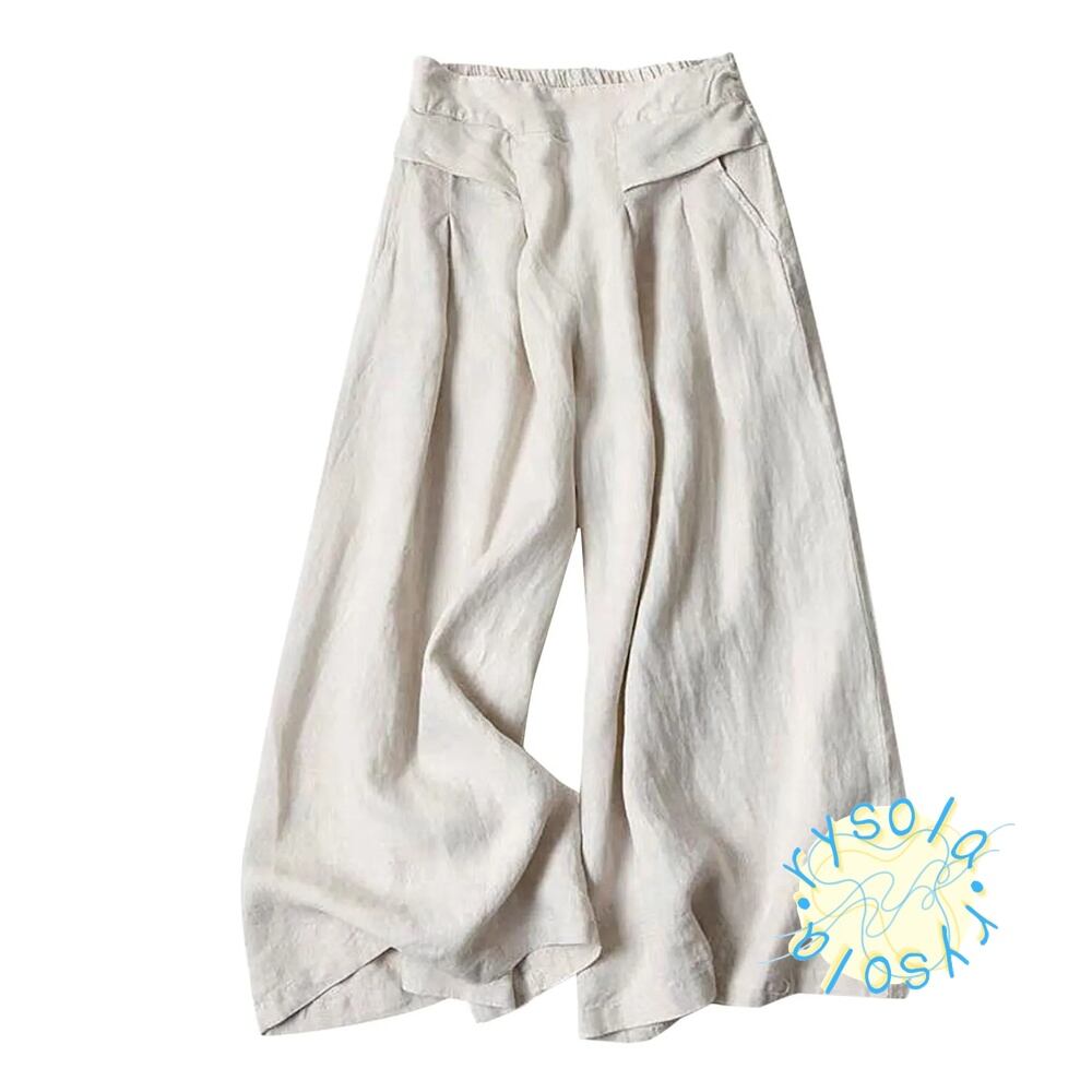 ワイドレッグリネン コットンパンツ 伸縮性 ハイウエスト ワイド カプリパンツ 春 夏 T240612102220_02