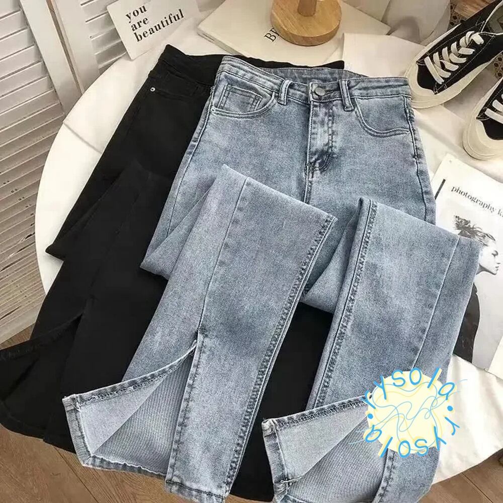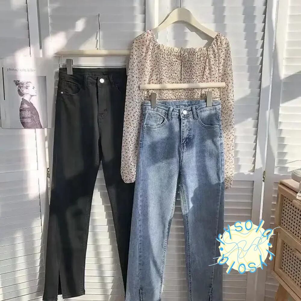 ハイウエスト サイドスリット 韓国スタイル エラスティックデニムパンツ ロング ウォッシュドパンツ 春 夏 新作 T240612102447_01