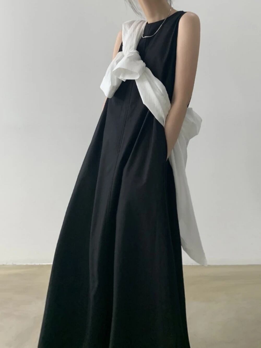 レディース ロングコットンリネンノースリーブワンピース ラウンドネック 韓国スタイル ニューコレクション フェミニン 無地 夏 T240624152127_03