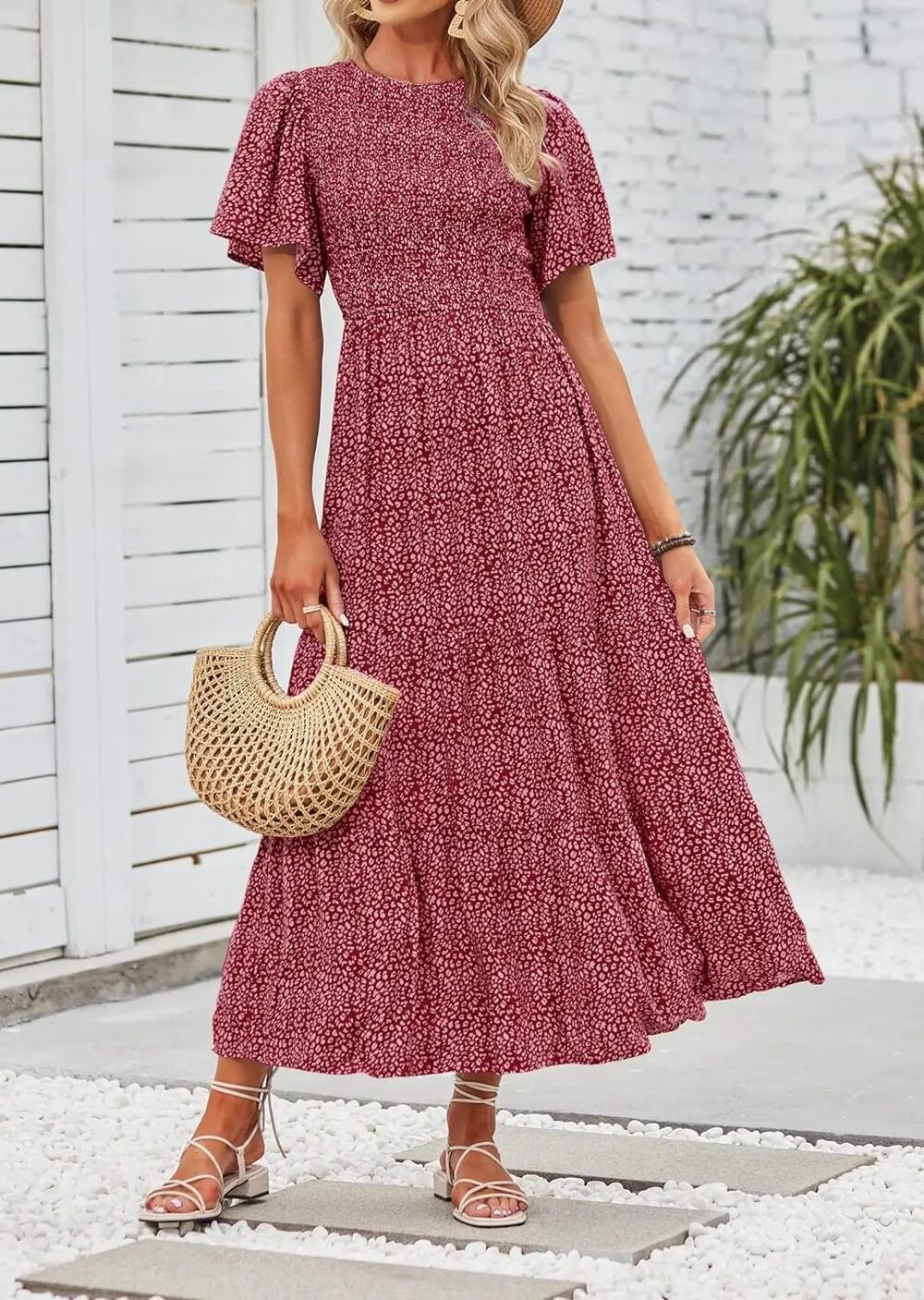 花柄 マキシワンピース クルーネック ハイウエスト レディース 半袖 スモーク 夏 T240624152137_06