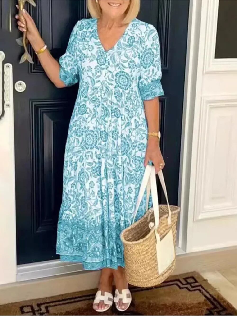 Vネック イブニングワンピース 服 レディース フローラルプリントロングワンピース 袖 スタイル 夏 T240624152154_03