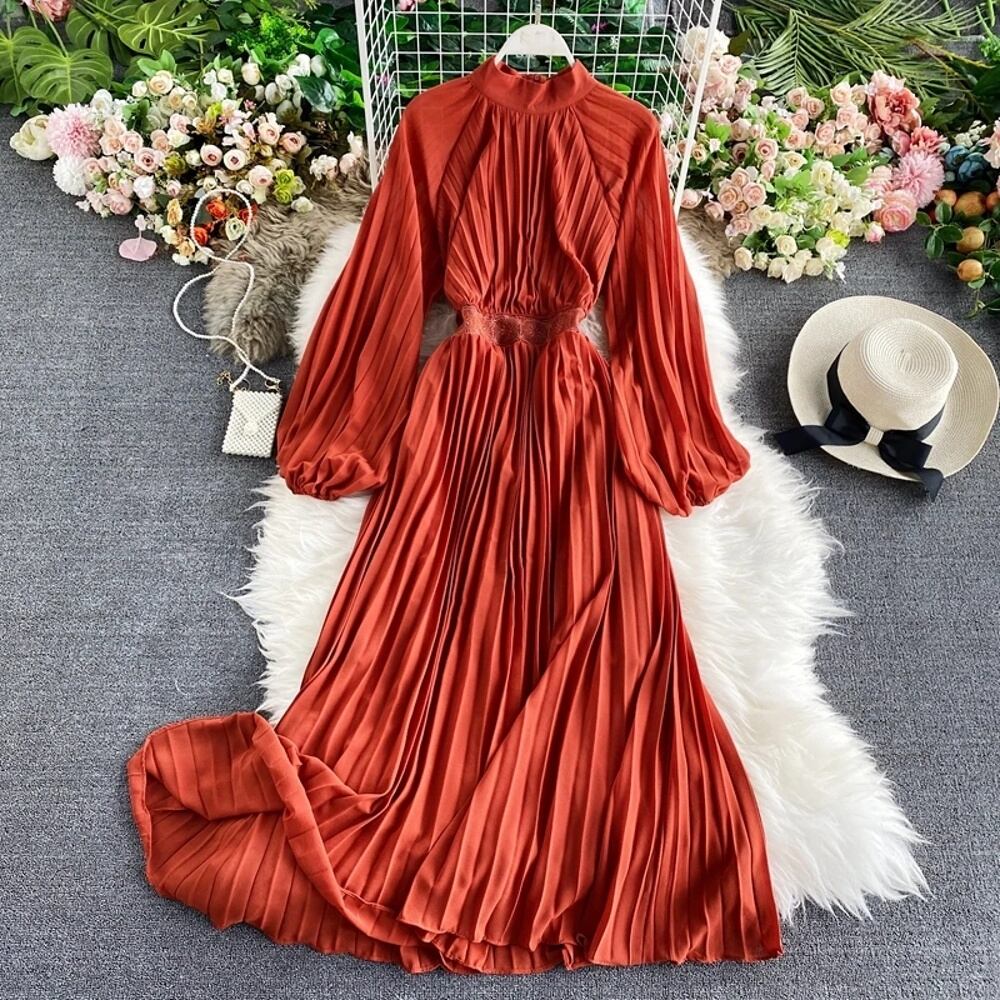 ハイウエストAラインドレス スタンドカラー Ewq レディース ファッション プリーツ 単色 秋冬 T240829144524_05