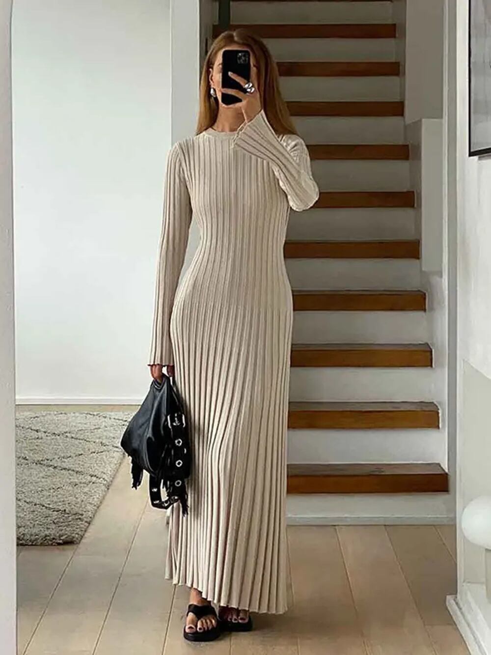 レディース レースアップ ストリートウェア ラウンドネックニットマキシワンピース 長袖 モノクロ 通勤 ファッション 秋 T240902130709_06