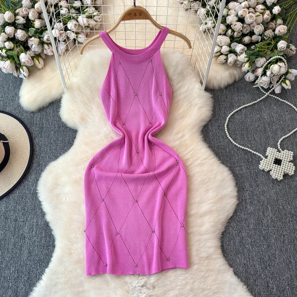 レディース ノースリーブニットワンピース ショートスカート ネック セクシー ダイヤモンド ピンク 赤 トレンド T240902131255_03