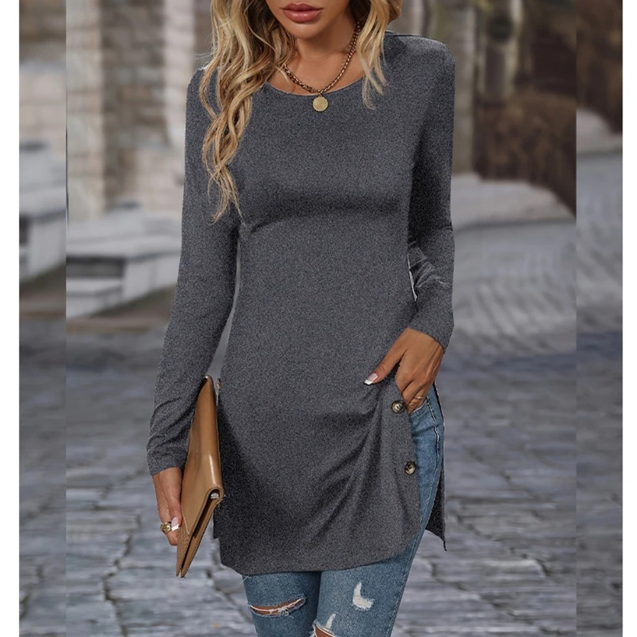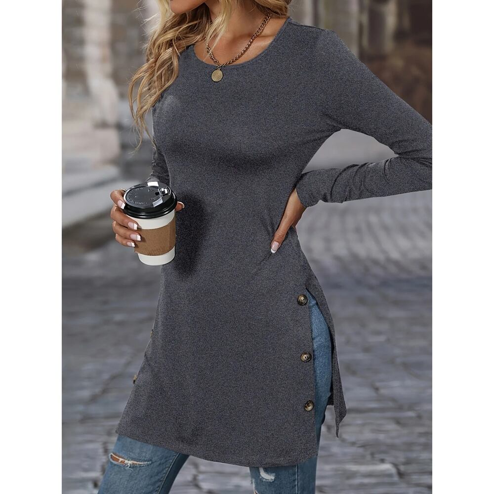 ワンピース ラウンドカラー 分割ボタン ショートワンピース 単色 トレンディ ヴィンテージ 秋 T240902132147_01