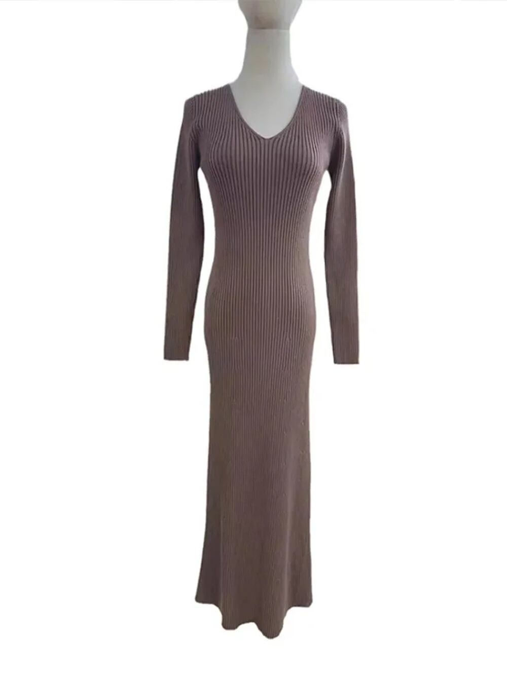 リブ編み ロングワンピース Vネック ワンピース ストリートウェア レディース 無地 長袖 カジュアル 秋 T240902132359_02