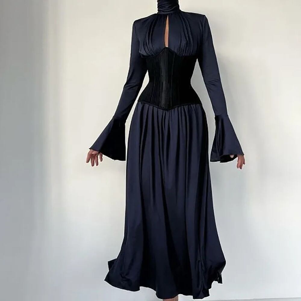 プリーツワンピース イブニングワンピース 透かし彫り フレアスリーブ ハイウエスト レディース タートルネック ロング 秋 T240902133416_02