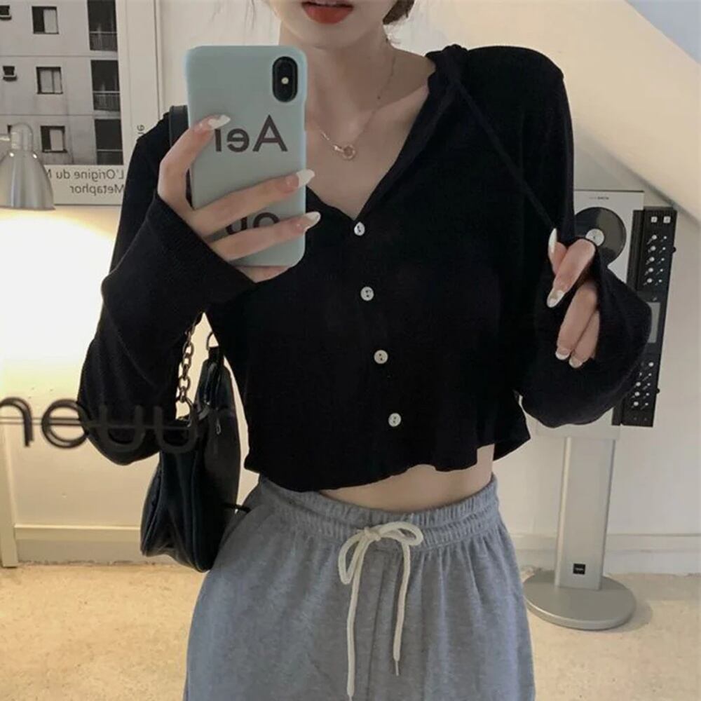 ニットウェア フード付きニットカーディガン レディース 長袖コート シングルブレストクロップトップ グレー カジュアルストリートウェア y k 秋 T240906153505_04 | HS-Store